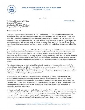 In a letter to Gov. Matt Mead, the head of the U.S. Environmental Protection Agency defended the agency’s water contamination tests in the Pavillion area and insisted a tentative link to hydraulic fracturing isn’t yet conclusive.